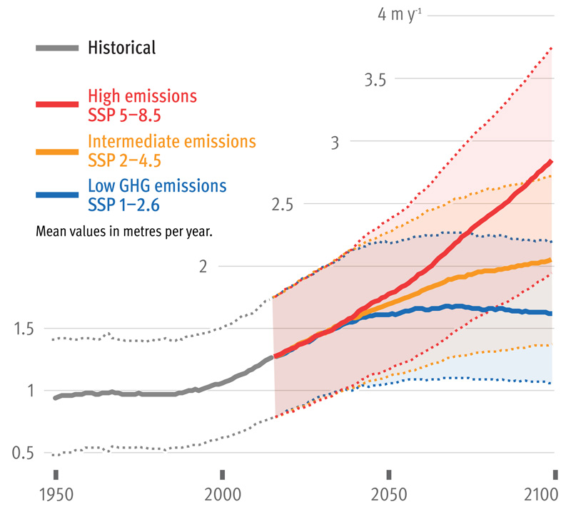Figure: Modelled Arctic coastal erosion rates at different greenhouse gas emission scenarios. ?